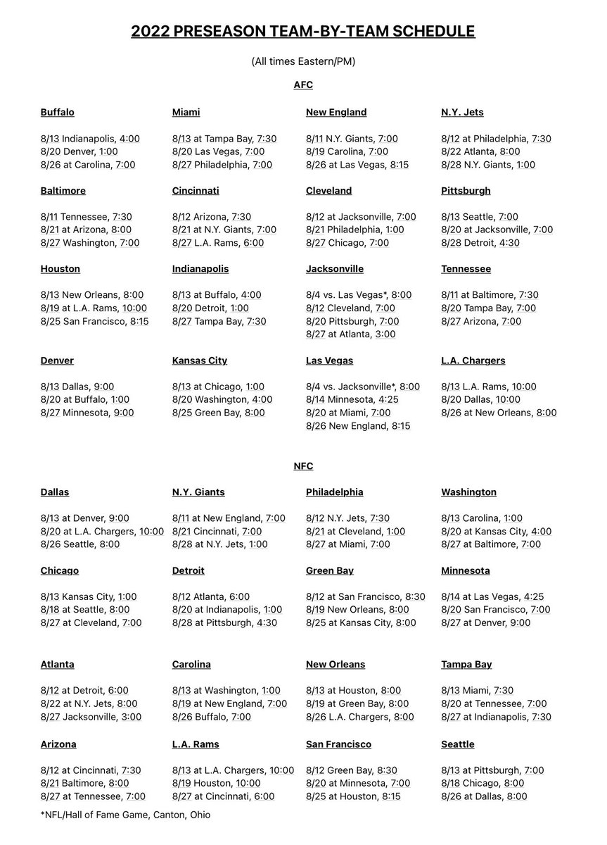 . But after a year away the preseason is returning and NFL teams will. The NFL announced the complete schedule for the 2022 preseason on Thursday. I dont recall them lasting any different amount of time from a regular season game.